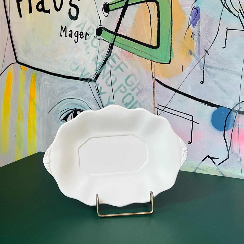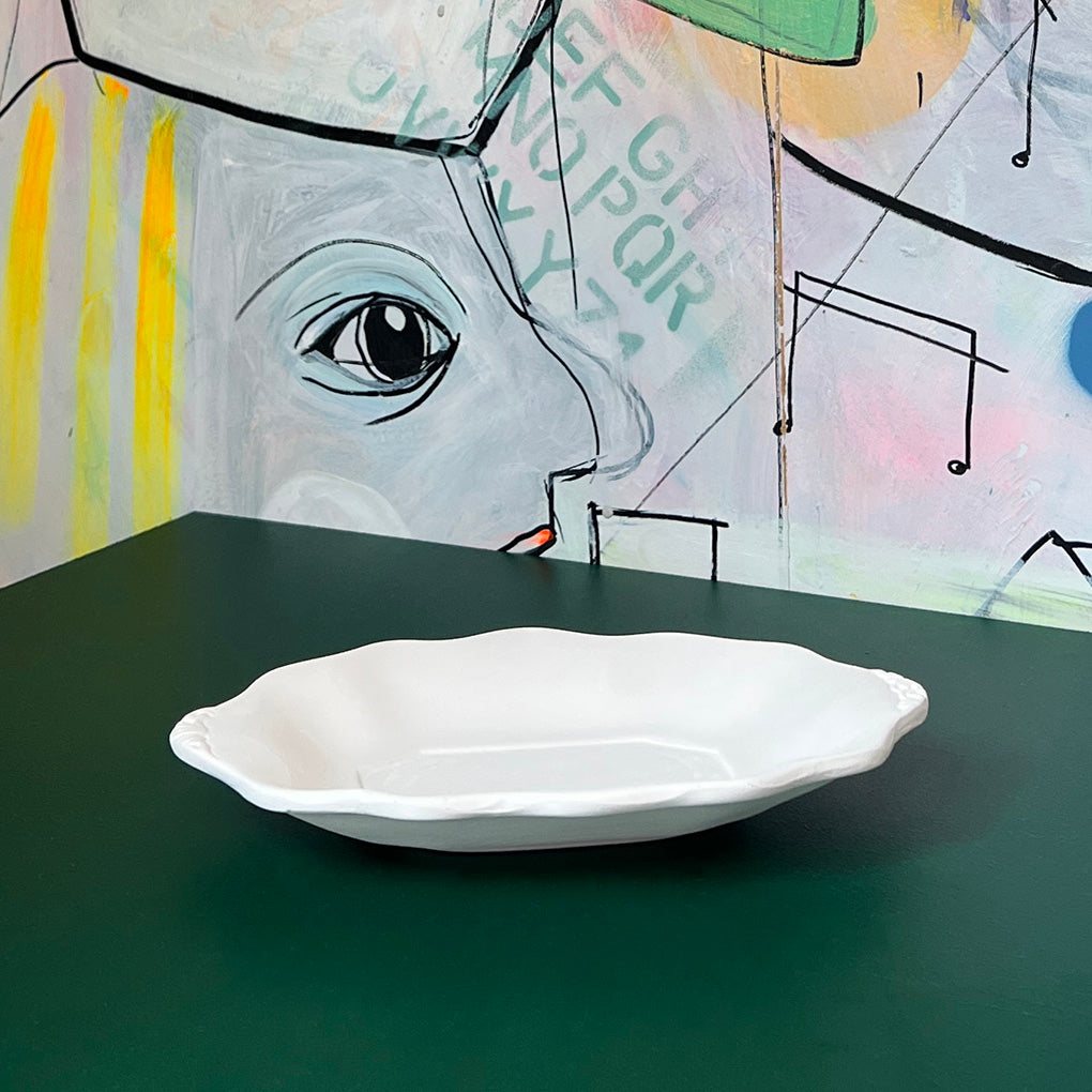 Vores lille konfektfad med bølgede kanter er som et lille stykke porcelæns-nostalgi, der er flyttet ind i keramikhylden. Formen er blød og bølget med fine detaljer i siderne - lige til at fylde med alt det, der hører til langsom hygge og “bare lige én mere”.